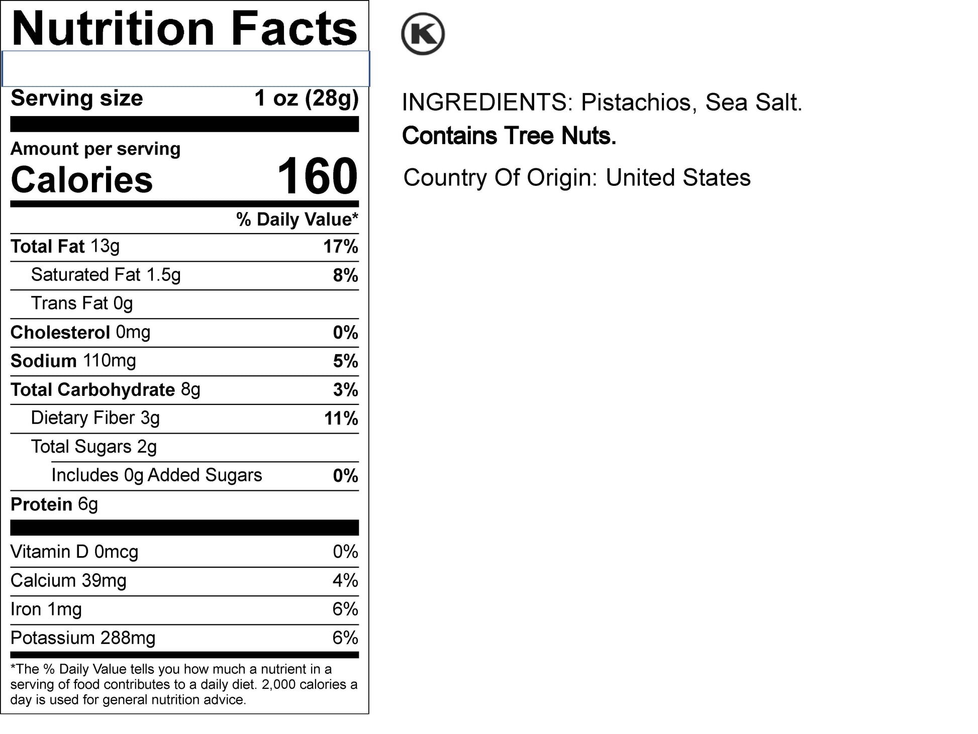 By sampling our roasted salted pistachios, you get to taste nuts that have been cultivated for over 8,000 years and famed for their healthy nutritional profile. To whip up this age-old treat, we begin by first picking the best pistachio nuts the USA has to offer. We then carefully roast them and follow that with a touch of salt to bring that sweet, nutty taste to life. With the shell still intact, you get all the health benefits that have placed pistachios in superfood status. We're talking about minerals, vitamins, antioxidants, protein, fiber, healthy carbohydrates and heart-friendly fats. With just a handful, you'll be treating your body to dozens of wholesome nutrients.