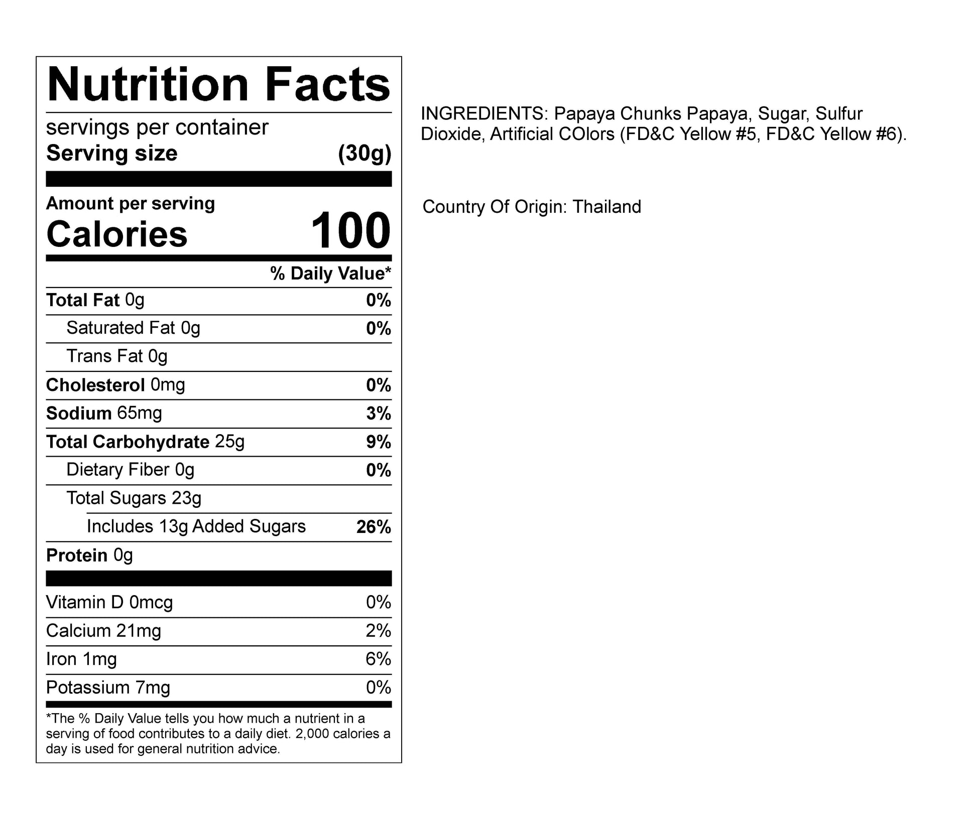 Our papaya chunks are a sweet, healthy treat that looks just as enticing as it tastes. The pieces are slightly larger than those of our papaya dices and are perfectly-sized for snacking. You can add a drop of lemon to enjoy a unique tropical twist or even season the chunks with salt and pepper for a burst of heat and flavor. You can also buy dried papaya chunks to give your pastries an exotic touch, sweeten your morning oatmeal, or add lovely color to your savory dishes. We carefully seal the finest fruit from Thailand that is harvested at its ripest to ensure mature taste and deliciously tender texture. Every serving is packed with minerals, vitamins, antioxidants and fiber that is beneficial to the digestive system. A handful of these a day and you'll soon be on your way to a healthier lifestyle.